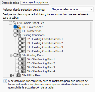 Ficha Subconjuntos y planos (cuadro de diálogo Tabla de lista de planos)