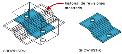 Es posible eliminar el historial de un objeto compuesto designado. Para ello, cambie el parámetro Historial para que esté establecido como Ninguno, o bien introduzca el comando BREP. Tras haber eliminado el historial, ya no se podrán designar y modificar los componentes originales del sólido eliminados. Se puede reiniciar la conservación del historial del sólido estableciendo de nuevo el parámetro de Historial en Registro.