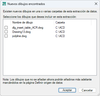 Cuando se añaden nuevos dibujos a la carpeta, el cuadro de diálogo Nuevos dibujos encontrados muestra una lista de los dibujos al editarse la extracción de datos. En ese momento, es posible seleccionar los nuevos dibujos que desea añadir a la extracción.