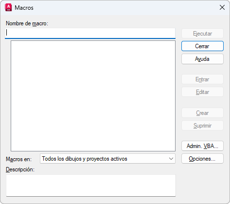 Presenta todas las macros encontradas en el dibujo o en el proyecto seleccionado en Macros en.