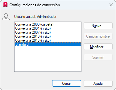 Muestra el cuadro de diálogo Modificar configuración de conversión, que permite especificar las opciones de la conversión de dibujos seleccionada.