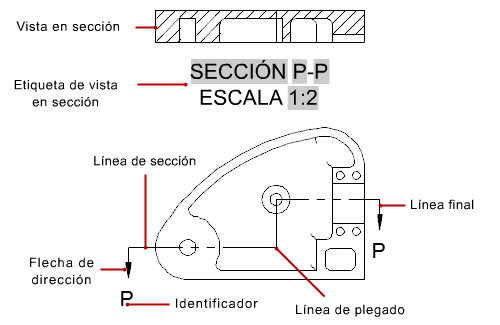 Una vista en sección de documentación del modelo es una vista proyectada a partir de una vista de dibujo existente, en la que se utiliza una línea de sección para cortar a través de la vista del dibujo a fin de mostrar su interior.