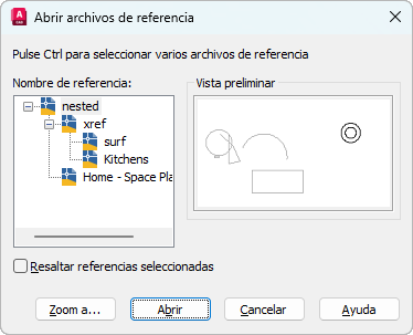 Cierra temporalmente el cuadro de diálogo Abrir archivos de referencia y amplía la vista para mostrar la referencia seleccionada en el área de dibujo. Pulse Intro para volver al cuadro de diálogo.