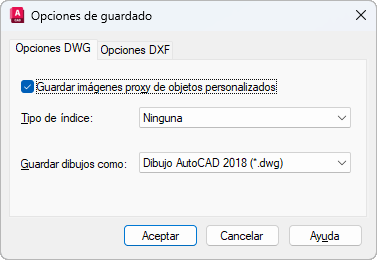 Si está guardando un dibujo parcialmente abierto que ya no contiene índices de capa y espaciales, esta opción estará desactivada.