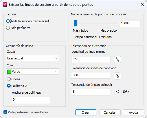 Cuadro de diálogo Extraer las líneas de sección a partir de nube de puntos