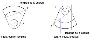 La distancia entre el punto inicial y el centro determina el radio. El otro final del arco se determina especificando la longitud de una cuerda entre el punto inicial y el punto final del arco.