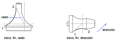 El orden de especificación de los puntos finales del arco determina la dirección de la curvatura del mismo. Para especificar el radio, puede especificarse un punto en la distancia de radio deseada o se puede indicar el radio.