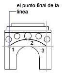 Es posible crear un arco especificando tres puntos. En el ejemplo siguiente, el punto inicial del arco se fuerza al punto final de una línea. El segundo punto del arco se fuerza al círculo medio de la ilustración.