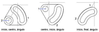 La distancia entre el punto inicial y el centro determina el radio. El punto final lo determina una línea que parte del centro y pasa a través del tercer punto.