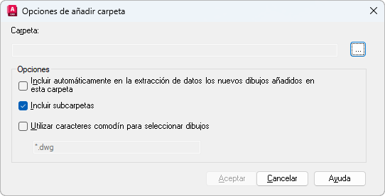 Incluye los dibujos nuevos en la extracción de datos cuando se añaden a la carpeta. El cuadro de diálogo Nuevos dibujos encontrados se muestra al añadir nuevos dibujos. Si está seleccionada esta opción, las carpetas especificadas son “vivas”. Si la opción no está seleccionada, las carpetas son “estáticas”.
