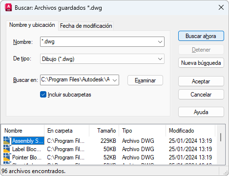 No es necesario introducir ninguna extensión de archivo en el cuadro Nombre, ya que el tipo de archivos que se incluyen en la búsqueda viene determinado por el cuadro De tipo. Por ejemplo, para encontrar el archivo casa102.dwg, escriba casa* y, en De tipo, seleccione Dibujo (*.dwg).