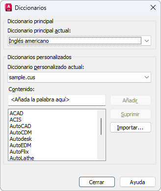 Muestra el nombre del diccionario personalizado actual. La extensión de nombre de archivo .cus se utiliza para los diccionarios personalizados de AutoCAD.