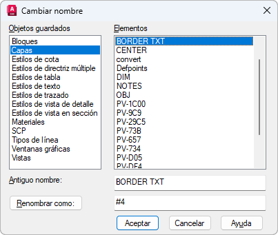 Cambia el nombre asignado a los objetos guardados, tales como las capas o los estilos de cota.