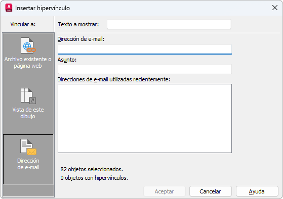 Permite especificar una dirección de correo electrónico a la que asociar el hipervínculo. Cuando se ejecuta el hipervínculo, se crea un nuevo mensaje de correo electrónico en el programa de correo por defecto del sistema.