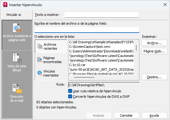 Muestra la ruta del archivo asociado al hipervínculo. Si selecciona Usar ruta relativa de hipervínculo, se muestra sólo el nombre de archivo. Si no selecciona Usar ruta relativa de hipervínculo, se muestra el nombre y la ruta completa del archivo.