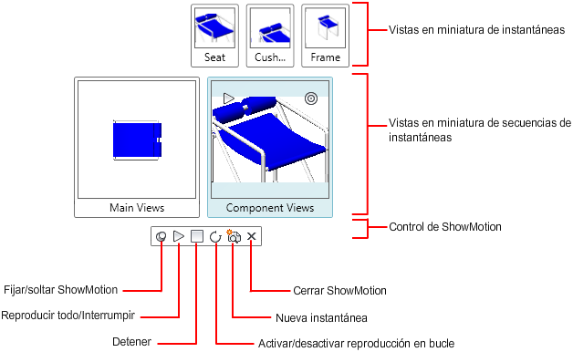 ShowMotion consta de tres partes principales: miniaturas de instantánea, miniaturas de secuencia de instantáneas y control de ShowMotion. Con el control de ShowMotion, a lo largo de la parte inferior, puede reproducir las animaciones asignadas a una instantánea, bloquear y desbloquear ShowMotion y cerrar ShowMotion. Utilice las miniaturas de instantáneas y secuencia de instantáneas para navegar por las instantáneas en el modelo actual.