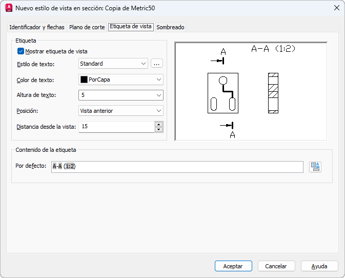 Define la posición de la etiqueta de vista en sección en relación a la vista en sección.