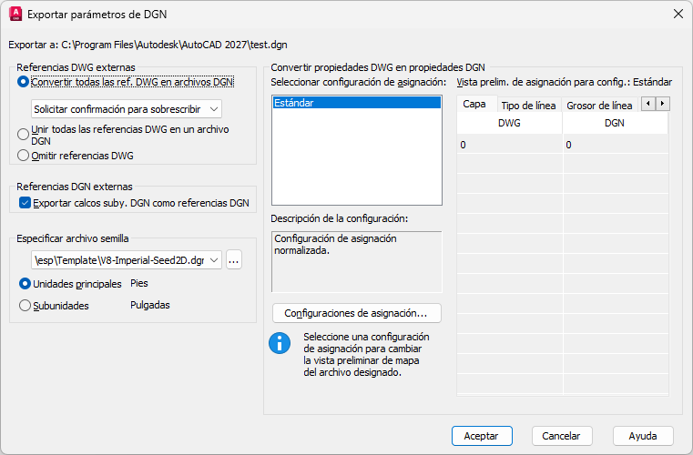 Selecciona y administra la configuración de asignación usada en la exportación DGN actual.