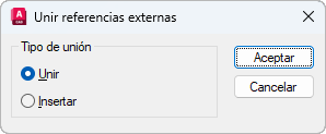 Si se une una referencia externa al dibujo actual, la referencia externa y todos sus objetos guardados dependientes pasan a formar parte del dibujo actual. Utilice UNIRX para añadir objetos guardados dependientes de referencias externas individuales, como bloques, estilos de texto, estilos de cota, capas y tipos de línea, a la tabla de definiciones local. Existen dos métodos para unir referencias externas al dibujo actual: Unir e Insertar. Unir modifica los nombres de tabla de definiciones de una referencia externa cuando se inserta. Insertar no modifica los nombres de tabla de definiciones de una referencia externa cuando se inserta. Para unir una referencia externa anidada, también debe seleccionar la refx principal.