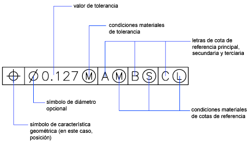 Un rectángulo de tolerancia está formado por dos o más componentes. El primer rectángulo de tolerancia contiene un símbolo que representa las características geométricas a las que se aplica una tolerancia, por ejemplo, ubicación, perfil, forma, orientación u oscilación. Las tolerancias de forma controlan las características lisa, plana, circular o cilíndrica y los perfiles controlan la línea y la superficie. En la ilustración, la característica es la posición.