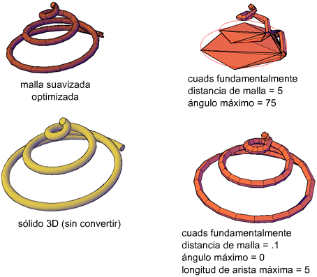 También es posible convertir otros tipos de objeto, aunque la conversión podrían dar resultados distintos de los esperados. Entre estos objetos están las superficies y los sólidos de barrido, los objetos de poligonales y policara originales, las regiones, las polilíneas cerradas y los objetos creados con 3DCARA. Para estos objetos, con frecuencia se pueden mejorar los resultados si se ajustan los parámetros de conversión.