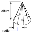 Precisa la ubicación del punto final del eje del cono. El punto final del eje es el punto superior del cono o el punto central de la cara superior del tronco del cono (opción Radio superior). El punto final de eje se puede ubicar en cualquier parte del espacio 3D. El punto final del eje define la longitud y orientación del cono.