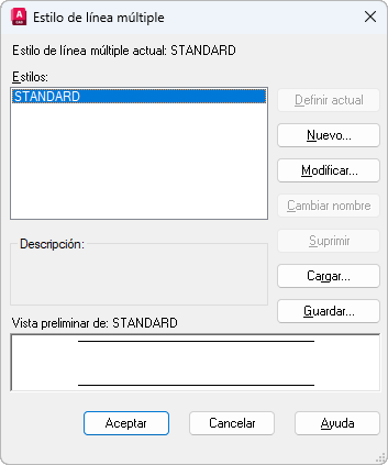 Muestra el cuadro de diálogo Crear nuevo estilo de línea múltiple, en el que puede crear un estilo de línea múltiple nuevo.