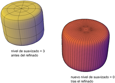 Refinar un objeto incrementa el número de caras editables al convertir también en caras las facetas subyacentes. El número de caras resultante depende del nivel de suavizado utilizado en ese momento. Los niveles de suavizado alto dan como resultado un número mayor de caras tras la operación de refinado.