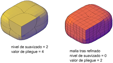 Los pliegues que están establecidos como Siempre mantienen su nitidez, independientemente de las operaciones de suavizado y refinado realizadas en el objeto. Sin embargo, este comportamiento cambia si se asigna un valor de pliegue. Si refina un objeto o una arista con un valor pliegue, el valor asignado se reducirá según el valor del nivel de suavizado original. Suponga que añade un pliegue con un valor de 4 y, a continuación, refina una malla cuyo nivel de suavizado es 2. El nuevo valor del pliegue será 2.