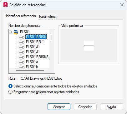 Para seleccionar la referencia que desea editar, designe un objeto de la referencia. Si designa un objeto que forma parte de una o más referencias anidadas, dichas referencias anidadas aparecerán en el cuadro de diálogo.
