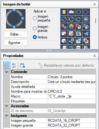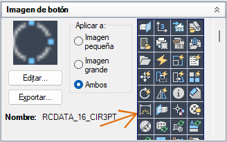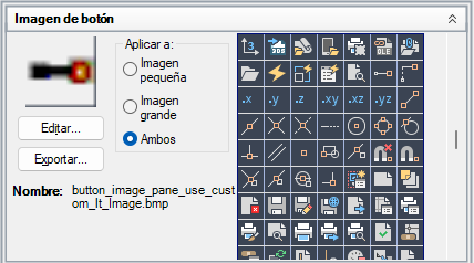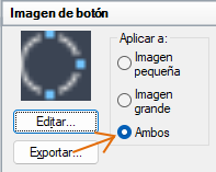 En el panel Imagen de botón, bajo Aplicar a, seleccione una de las tres opciones de asignación de imágenes: Imagen pequeña, Imagen grande o Ambas.