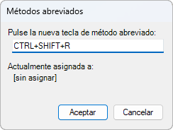 5. En el cuadro de diálogo Métodos abreviados, mantenga pulsada la tecla modificadora Ctrl con una combinación de Mayús, Alt o Mayús y Alt junto con la letra, el número, la función o la tecla virtual (por ejemplo F1 o Insertar) que desee.
