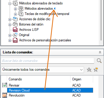 • Para crear un método abreviado, vaya al panel Lista de comandos y arrastre un comando al nodo Métodos abreviados del panel Personalizaciones en <nombre de archivo>.