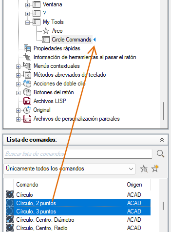 7. En el panel Lista de comandos, arrastre el comando que desea añadir al submenú en el panel Personalizaciones en <nombre de archivo>.