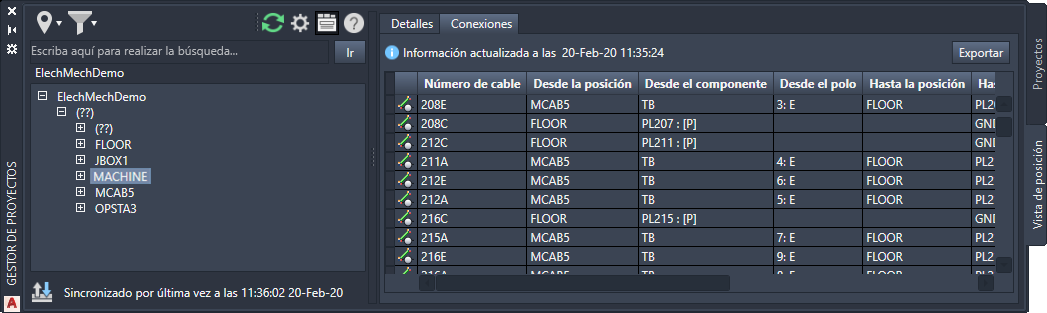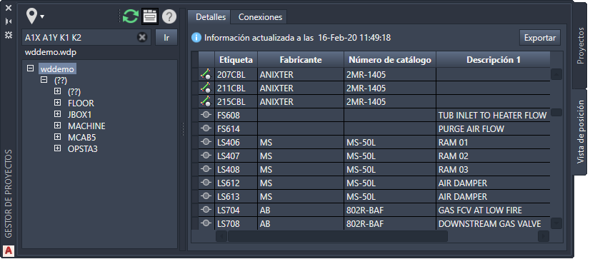 Seleccione la ficha Vista de posición. Seleccione el nodo o dispositivo del árbol cuyos detalles o conexiones desea ver. Seleccione el nodo superior para ver el proyecto completo. Haga clic en .