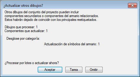 Aparecerá el cuadro de diálogo Actualizar otros dibujos. Este cuadro de diálogo advierte de que otros dibujos del conjunto del proyecto incluyen componentes secundarios o componentes de armario relacionados.