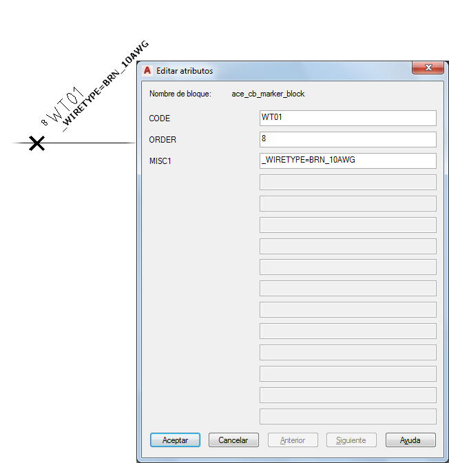 Se puede aplicar el tamaño mínimo de cable de una carga de motor seleccionada en el nombre de capa del tipo de cable. El valor, que se extrae de la base de datos ace_electrical_standards.mdb, se puede sustituir por cualquier cadena “@WSIZE@” que se encuentre en el valor “_WIRETYPE=”. Utilice esta variable en el atributo MISC1 del bloque de marcador del cable o bien en la hoja de cálculo como parte de la llamada a la API de tipo de cable.
