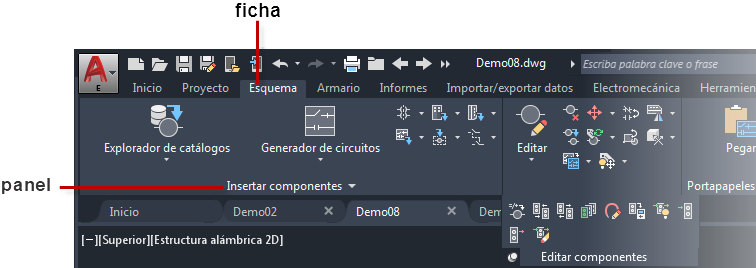 Generador de circuitos, Esquema es el nombre de la ficha, Insertar componentes es el nombre del grupo de la ficha y Generador de circuitos, el nombre del comando.