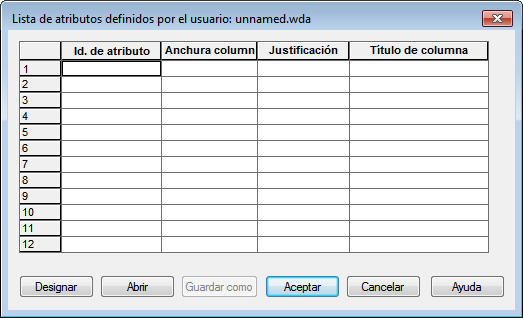 (Opcional) Especifique la anchura, la justificación y el título de la columna del atributo para la generación de informes. Si se deja en blanco, se utilizarán los siguientes valores por defecto.