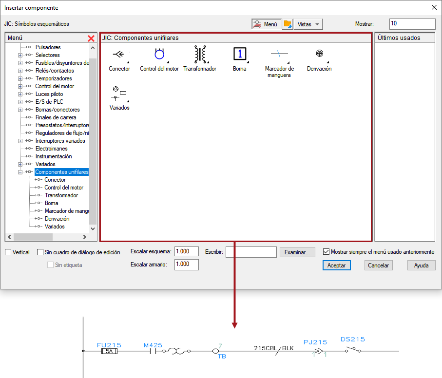 Los símbolos unifilares siguen la misma convención para los nombres que los símbolos principales y secundarios del esquema. Para hacer únicos los nombres de símbolo, los nombres de bloque de símbolos unifilares incluyen un sufijo “1-”. Sin embargo, el nombre del símbolo no define a éste como un símbolo unifilar. El símbolo unifilar se define por la existencia de un atributo TIPOWD con un valor “1-” en el símbolo, o bien un valor “1-1” si se trata de un símbolo de derivación unifilar.