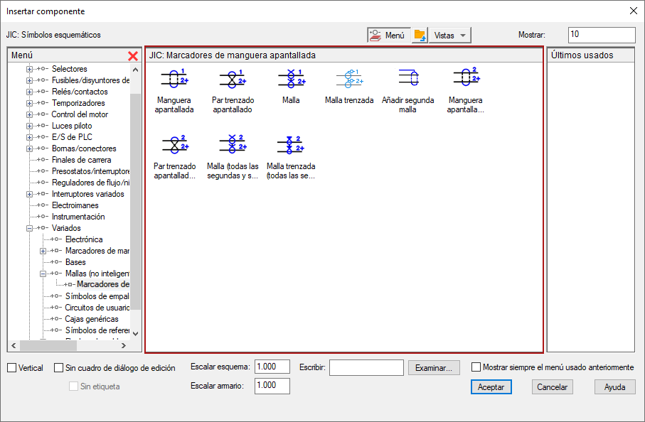 Los componentes de esquema como, por ejemplo, relés, interruptores, pilotos y dispositivos discretos de control del motor (excepto símbolos de E/S de PLC) siguen la convención de denominación que se indica a continuación: