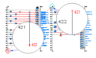 En una plantilla unifilar de circuito doble existen tres símbolos de derivación. Uno en el punto normal donde el circuito se une al bus. Existe otra versión del símbolo en cada uno de los dos "extremos" del circuito; cada uno marca el punto donde comienza dicha parte del circuito doble. Estos símbolos de derivación permiten que diversos informes muestren correctamente los datos sobre el circuito unifilar, ya sea una representación de circuito sencillo o doble.
