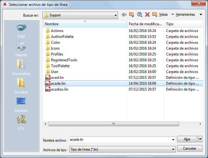 En el cuadro de diálogo Seleccionar archivo de tipo de línea, seleccione acade.lin y haga clic en Abrir.