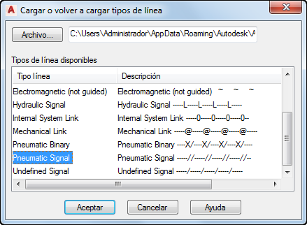 En el cuadro de diálogo Cargar o volver a cargar tipos de línea, seleccione Señal neumático y haga clic en Aceptar.