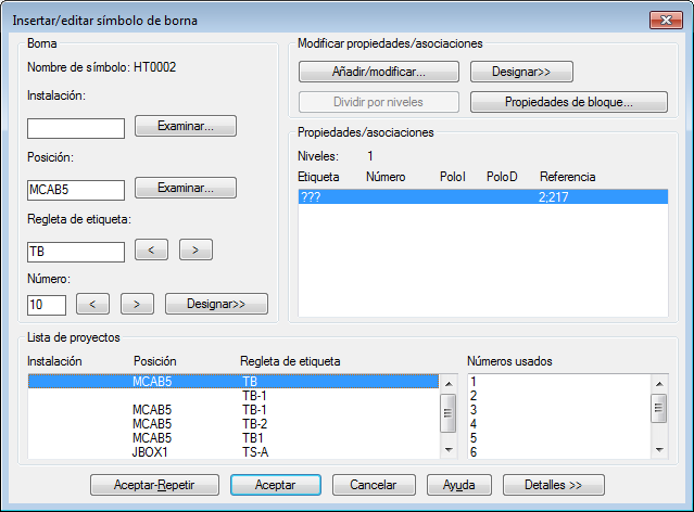 En el cuadro de diálogo Insertar/editar símbolo de borna, en la sección Lista de proyectos, seleccione Regleta de etiqueta TB.