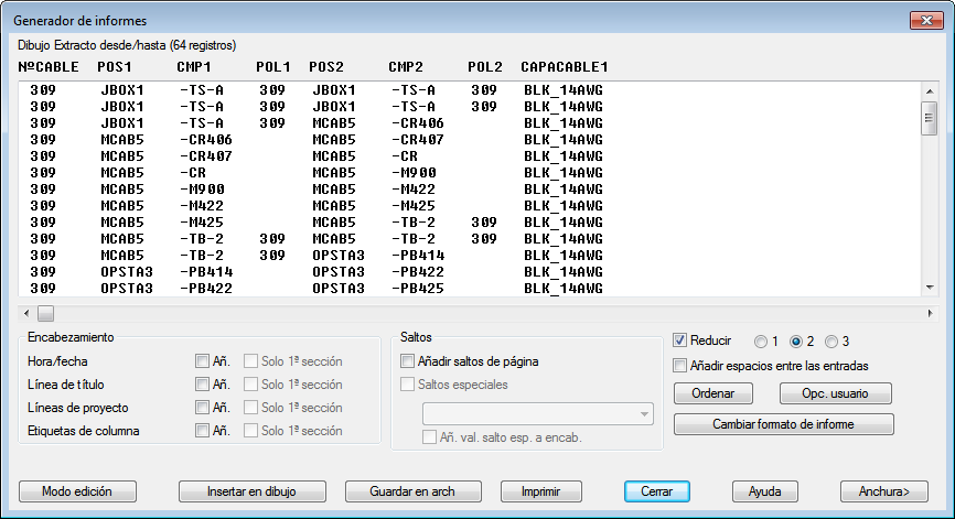 Los datos se envían al cuadro de diálogo Generador de informes, donde puede guardar el informe en un archivo, insertarlo como una tabla o imprimirlo.