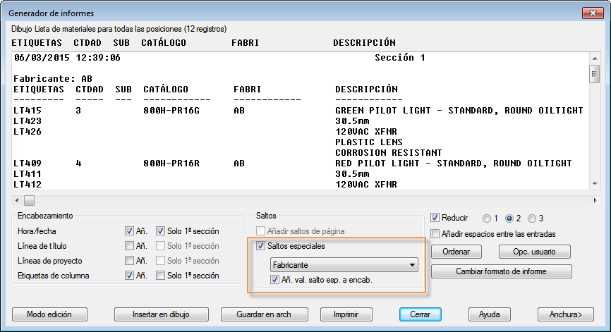 Si el alcance del informe está establecido en Proyecto, se puede partir una tabla de informes en varios dibujos. Una vez se ha definido un corte como se ha descrito, se puede definir el número de secciones de la tabla que se deseen en cada dibujo.