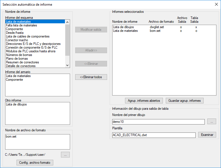 Seleccione el nombre del informe y un archivo de formato (.set) para cada informe que desee ejecutar. Los archivos de formato deben definir la salida de archivo, de tabla o de ambos.