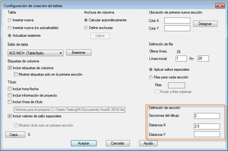 Tras seleccionar Saltos especiales y hacer clic en Insertar en dibujo, la opción Aplicar saltos especiales estará disponible en el cuadro de diálogo Configuración de creación de tablas. Esta opción permite insertar un objeto de tabla en cada sección en función de la opción Saltos especiales.