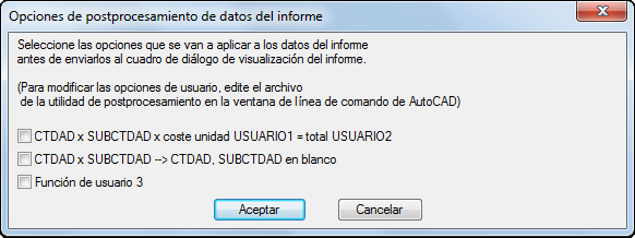 Cada tipo de informe tiene un archivo asociado LISP (.lsp) y el archivo de definición de cuadro de diálogo (.dcl) que se puede personalizar para postprocesar los datos del informe. Cuando ejecuta un informe, se muestran los datos en el cuadro de diálogo Generador de informes. Si hace clic en Opciones de usuario, se mostrará el cuadro de diálogo definido en el archivo .dcl asociado. El proceso real para cada una de las opciones del cuadro de diálogo está definido en el archivo .lsp.